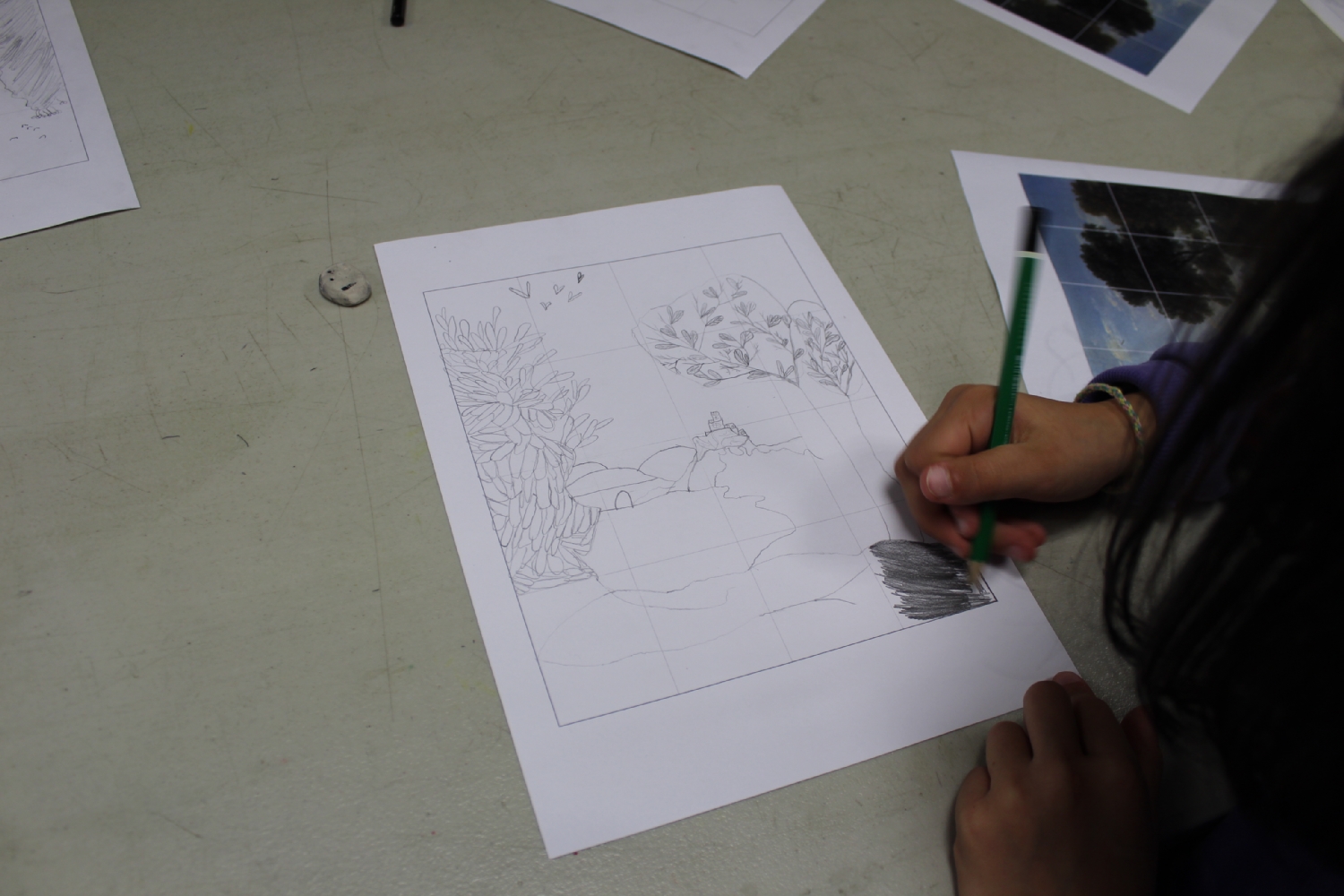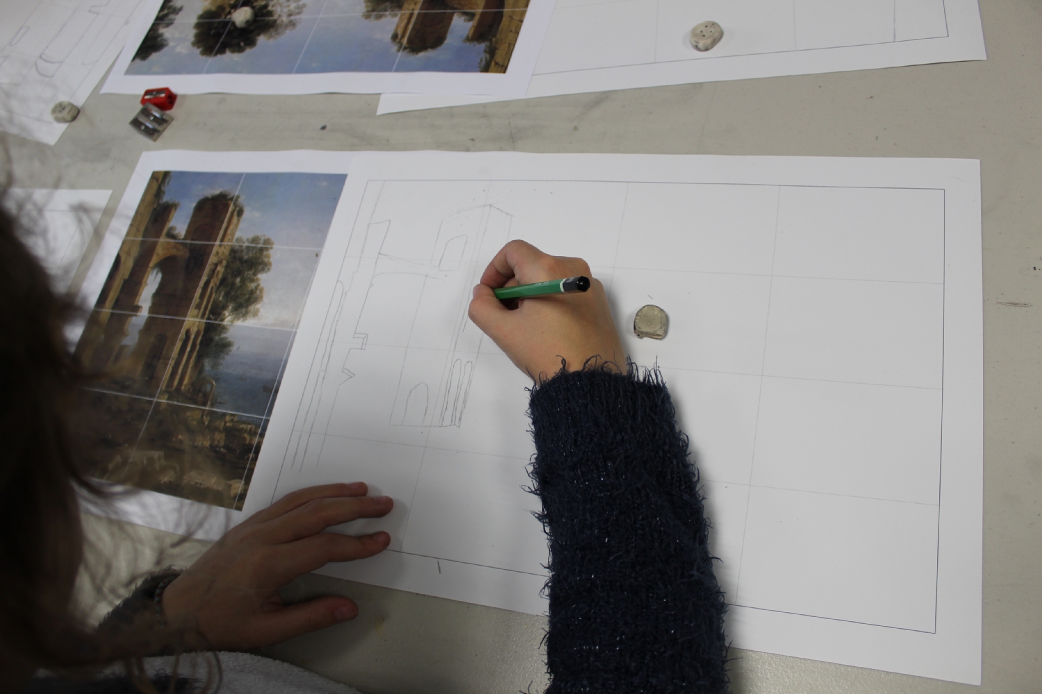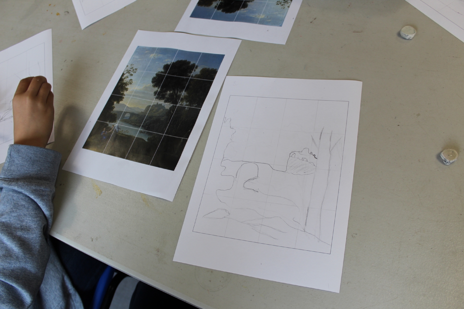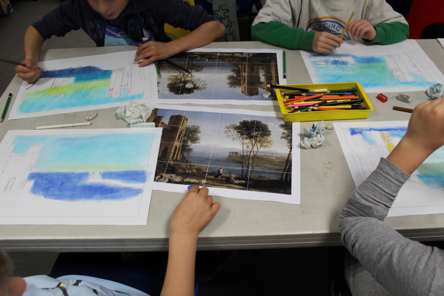 13h30-14h45 : Une fois le premier dessin en noir et blanc effectué, les élèves passent à la couleur, sur un format A3. Ils reproduisent une autre peinture de paysage de Le Lorrain, toujours à l'aide de la mise au carreau, en utilisant le pastel sec et les crayons de couleurs.