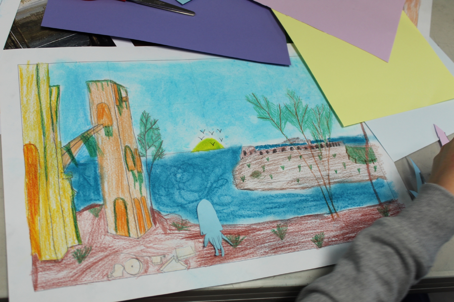 15h-16h : En fonction du temps restant, les élèves pourront imaginer quelle scène pourrait se dérouler dans ce dernier paysage en couleurs : personnages, animaux... Les figures sont dessinées sur papier coloré et découpées. Elles pourront être placées et déplacées dans le paysage.
