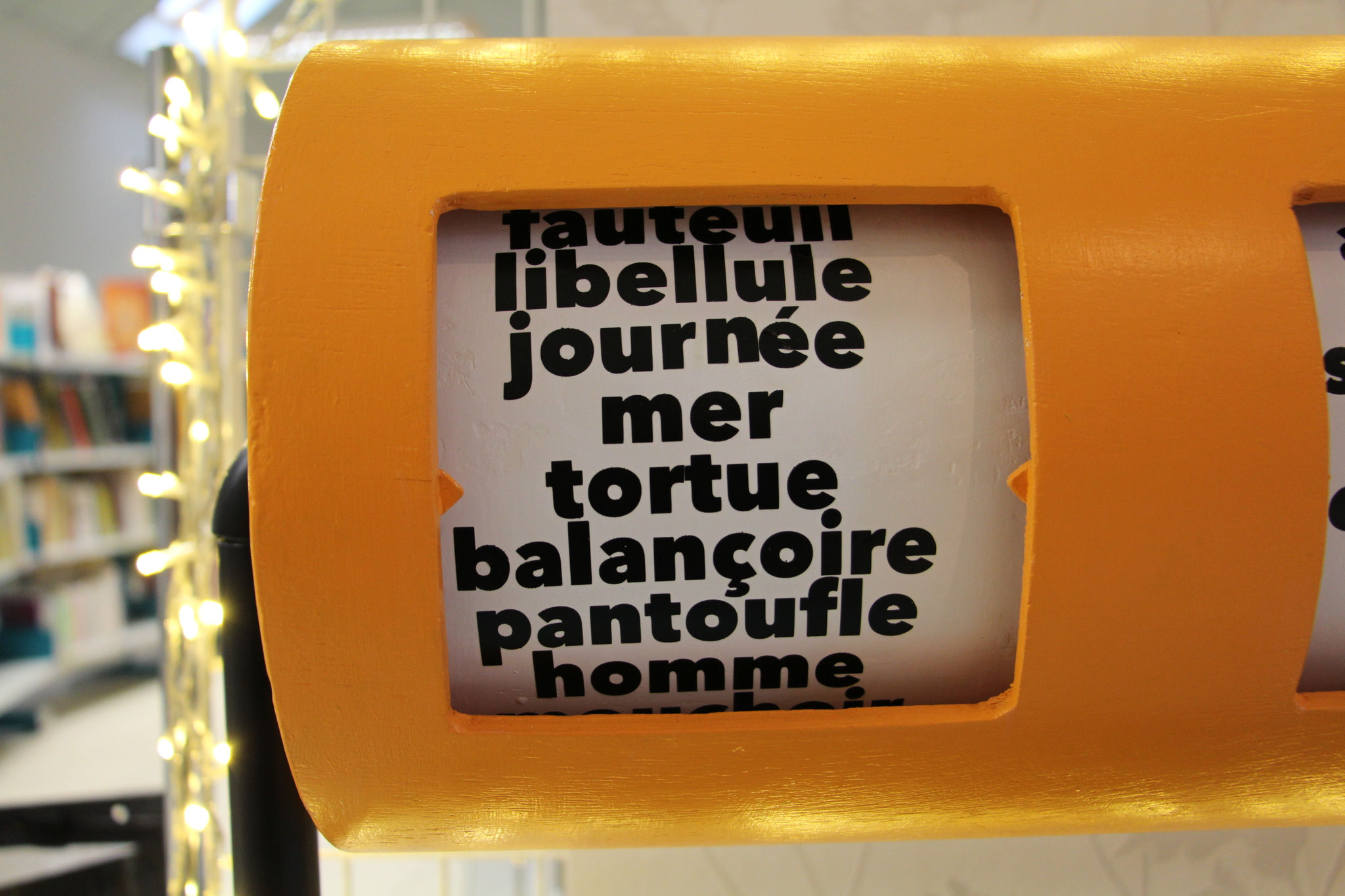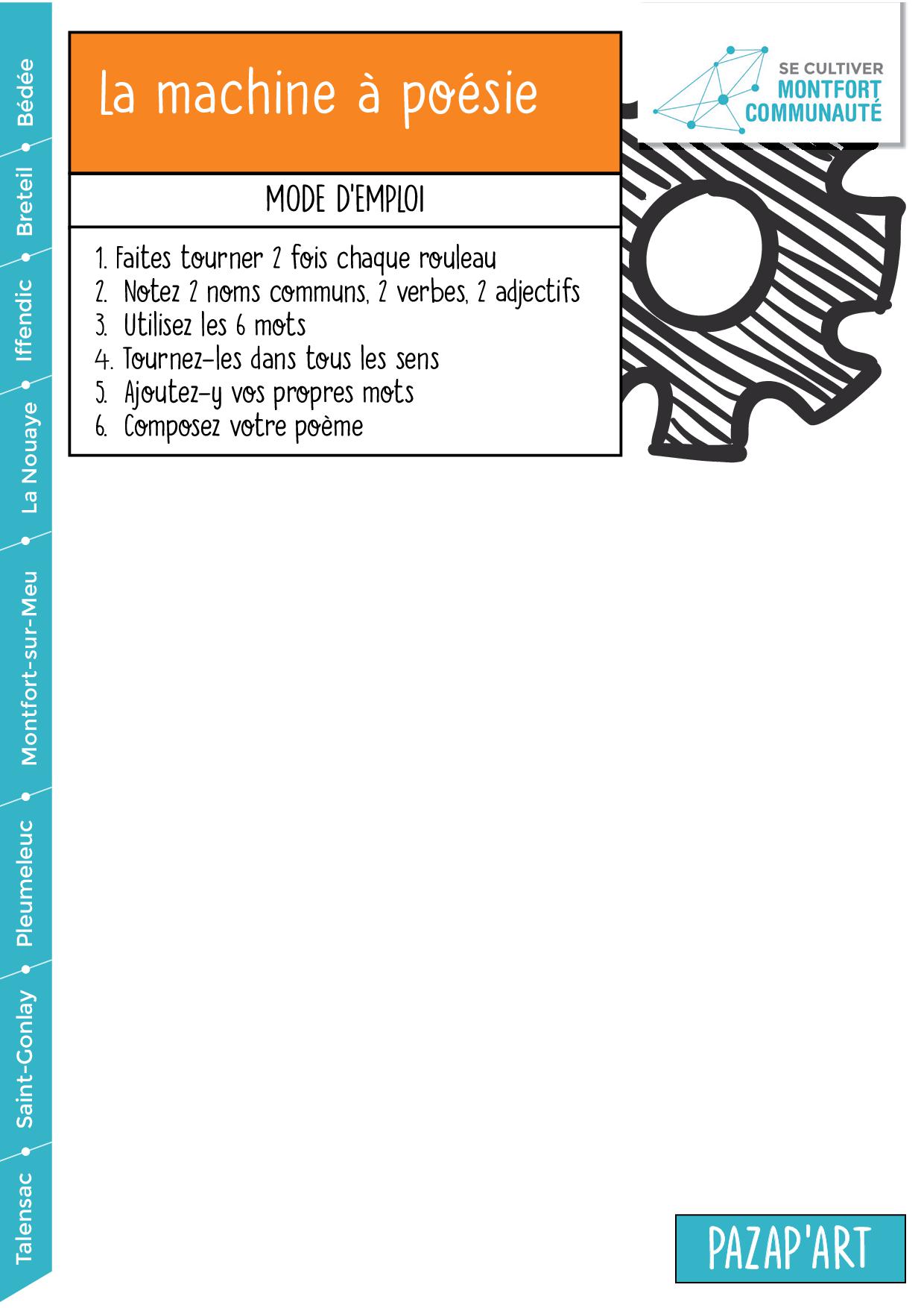 La machine à poésie est une création originale de l'artiste Fabien Gilles. Elle est composée de trois rouleaux sur lesquels sont inscrits des noms communs, des verbes et des adjectifs. On fait tourner les rouleaux, on récolte 2 noms communs, 2 verbes et 2 adjectifs, et on écrit un poème !